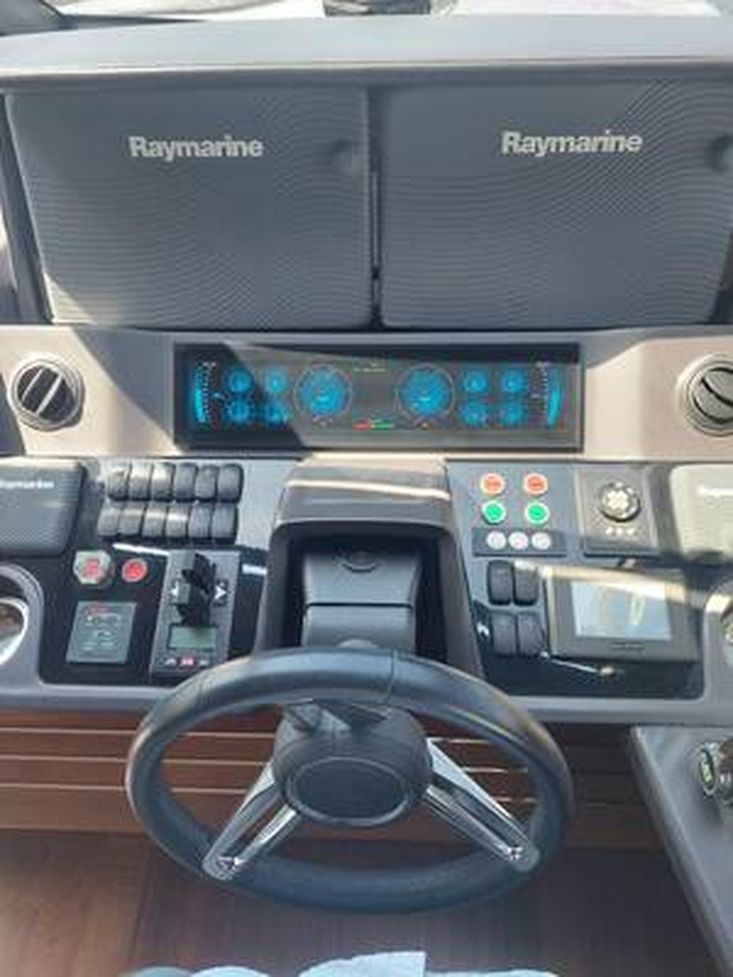 Princess 68 (2016) with CAT C18 engines, fin stabilizers, hydraulic swim platform, teak decks and full specification. Four-cabin layout plus crew, generator 14 kW, air-conditioning, water maker, bow/stern thrusters and comprehensive navigation package. Excellent condition, Malta flag, located in Bodrum Marina.